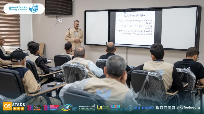 As part of its efforts to spread a culture of safety and prevention across campus, Lifelong Learning Center at University of Alkafeel , in collaboration with the Civil Defense Section , organized an awareness training course on Monday, August 25, 2025, "Civil Defense Basics." The course was presented by Eng. Hani Abdul Wahid, Head of Maintenance Section at the university .