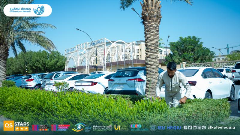 Agricultural Section Staff at University of Alkafeel continue their daily efforts to nurture and maintain the green spaces on campus. This work included pruning trees, maintaining green spaces, and removing summer plants to ensure a renewed and clean environment.
