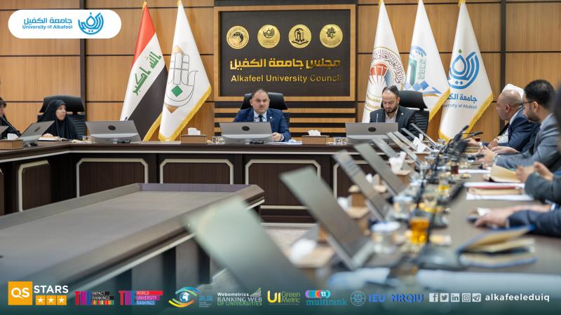 The University of Alkafeel Council held its meeting on Saturday, September 13, 2025, chaired by the University President, Prof.Dr. Nawras Mohammed Shaheed Al-Dahan, and attended by Prof.Dr. Nawal Ayed Al-Mayali, vice-chancellor for academic affairs, assistants and deans of colleges.