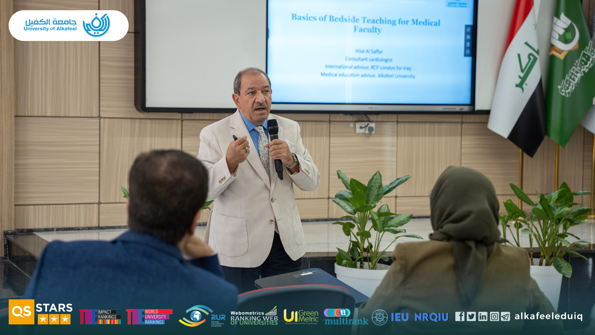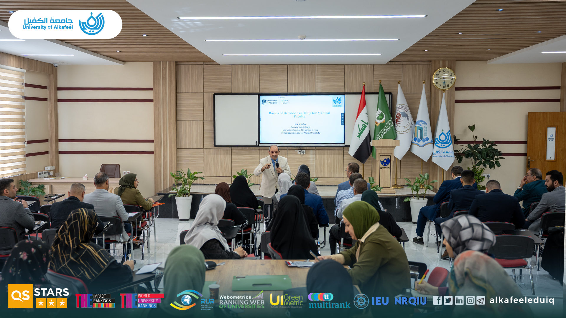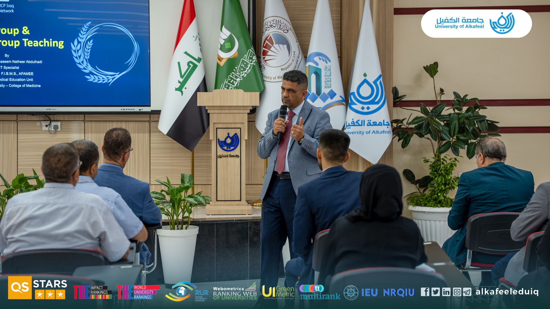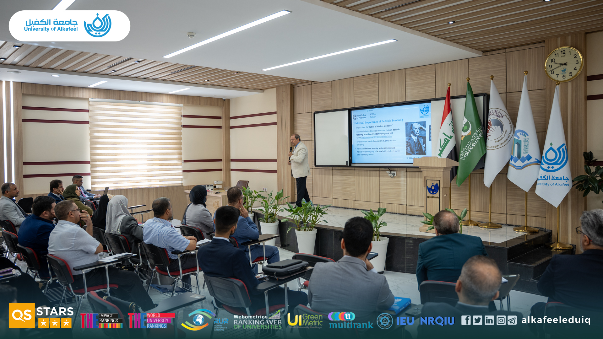 In his attendance, the university of Alkafeel president emphasized the importance of holding such specialized courses on an ongoing basis, as they are a pivotal element in developing academic performance and a motive to improve the educational process. Then he focused on supporting the faculty members in every possible way that contributes to developing their teaching and research capabilities. The President also commended the faculty members at university of Alkafeel and appreciated their active participation and commitment to raising the academic standard. At the end , Dr. Al-Dahan promised that the university will continue its efforts to support training programs that reinforce the quality of medical education and the process of academic accreditation.