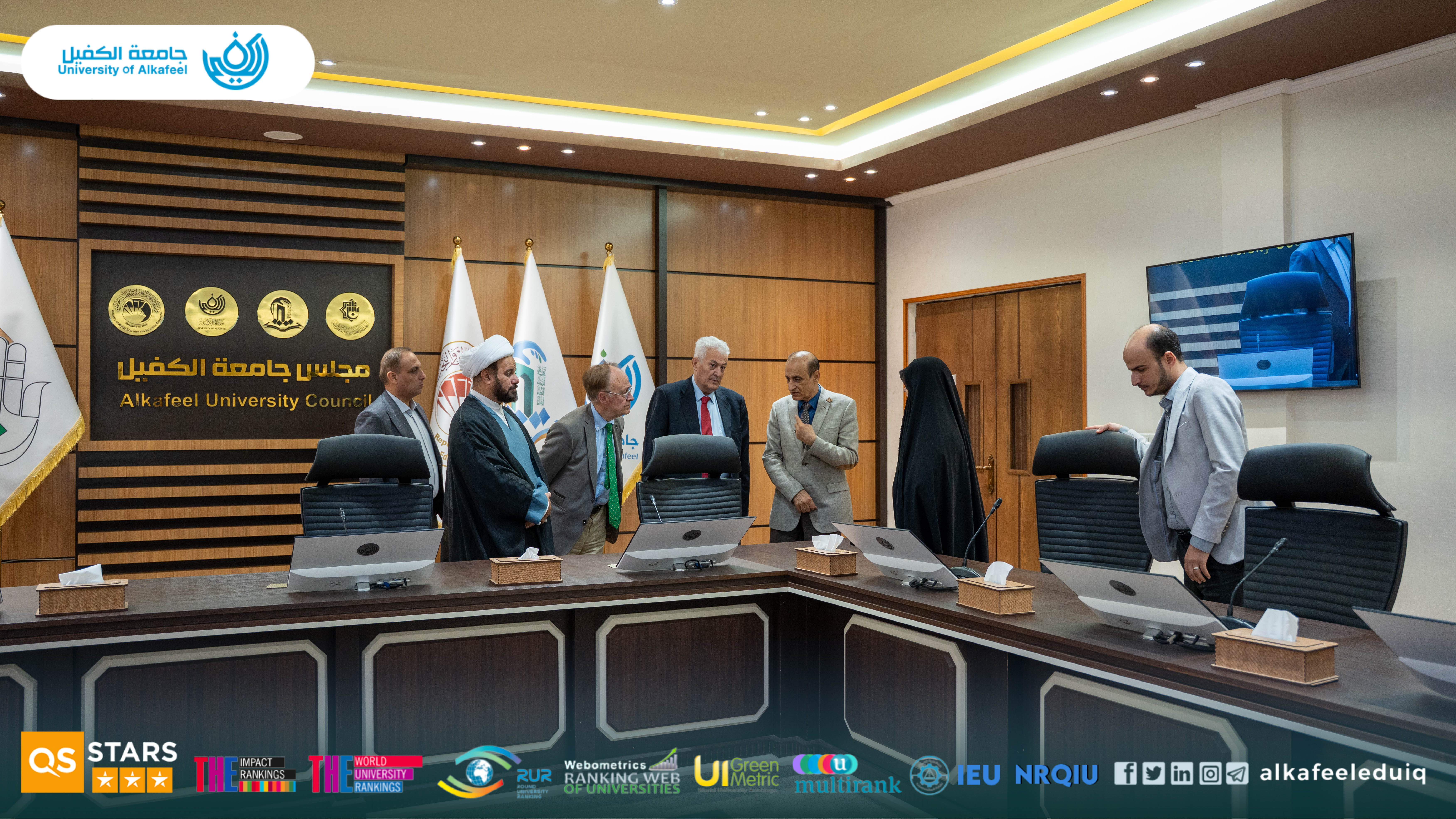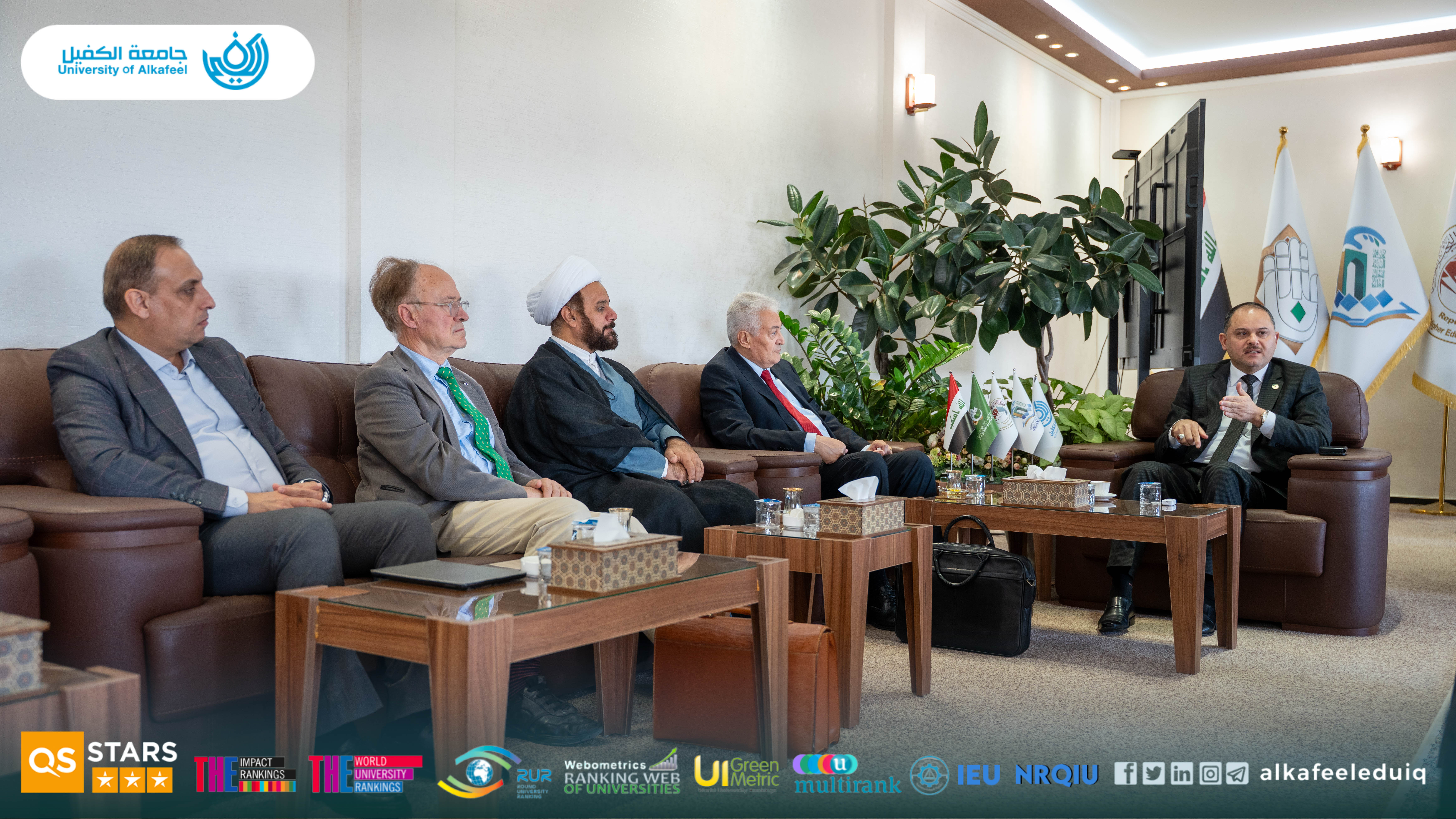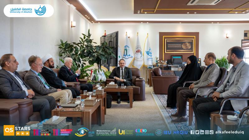 On Saturday, 4 October 4 2025, the President of University of Alkafeel , Prof.Dr. Nawras Mohammed Shaheed Al-Dahan, received a delegation from the Paris Academy of Geopolitics, in the presence of the vice-rector for scientific affairs , Prof.Dr. Nawal Ayed Al-Mayali . The visit aimed to discuss horizons of academic and scientific cooperation between the two sides and enhance the exchange of expertise and knowledge, which would contribute to the development of university performance and communication channels with international academic institutions.