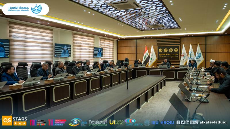 University of Alkafeel Council held its second session for the 2025-2026 academic year, chaired by the University President, Prof.Dr. Nawras Mohammed Shaheed Al-Dahhan, and attended by the Vice President for Scientific Affairs, Prof.Dr. Nawal Ayed Al-Mayali, the deans and assistant deans, on Monday, 24 November 2025.