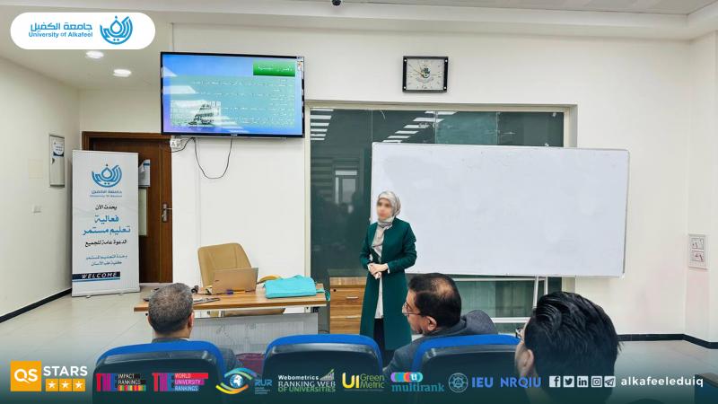 The workshop was presented by Asst. Lect. Zahraa Mohammed Alwan, who explained the concept of internet addiction, its types, and its effects on mental and physical health, in addition to addictive behaviors associated with the use of smart devices and social media.
