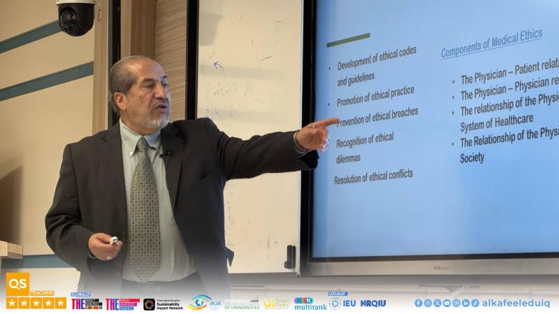 On Sunday, 4 January 2026, the College of Medicine at University of Alkafeel held a scientific lecture as part of its medical education program : "Medical Ethics." The lecture was delivered by Professor Mahdi Saeed from the University of Michigan, USA.