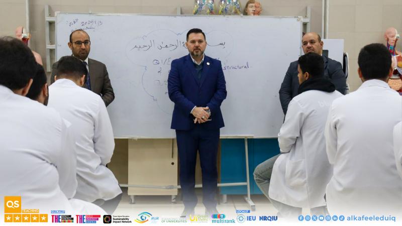 The Dean of the College of Pharmacy at University of Alkafeel held an orientation meeting attended by Asst. Prof. Dr. Ali Ahmed Hussein Al-Mayali, Vice-Dean for Administrative Affairs, and Prof. Dr. Hassanein Shaker Mahmoud, Vice-Dean for Scientific Affairs, with first-year students. The meeting aimed to enhance direct communication, address academic and administrative challenges, provide psychological and moral support, and motivate students to strive for excellence and persevere.